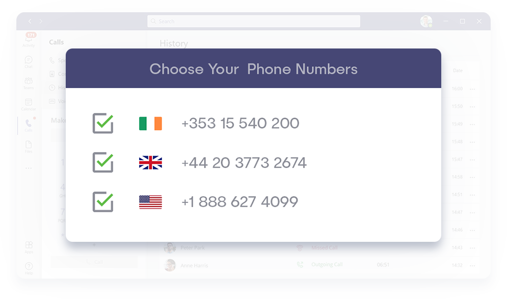 Port your existing numbers and use them in Microsoft Teams. You can also get new international numbers from 100+ countries.