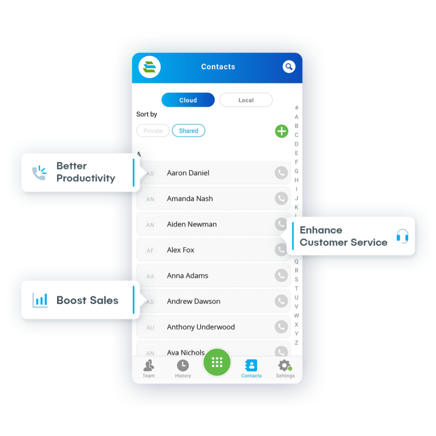 Access shared office phonebook directly from the app so you don’t miss any business contact.