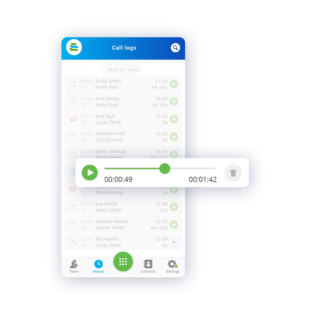 All calls are saved, recorded and can be listening on the go, directly from the app.
